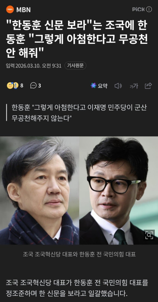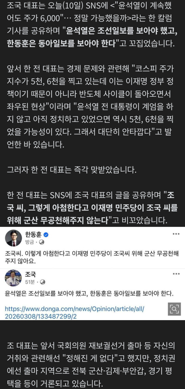 조국 조국혁신당 대표가 한동훈 전 국민의힘 대표를 정조준하며 한 신문을 보라고 일갈했습니다. 조국 대표는 오늘(10일) SNS에 <"윤석열이 계속했어도 주가 6,000"… 정말 가능했을까>라는 한 칼럼 기사를 공유하