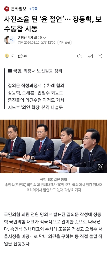사전조율 된 ‘윤 절연’… 장동혁, 보수통합 시동