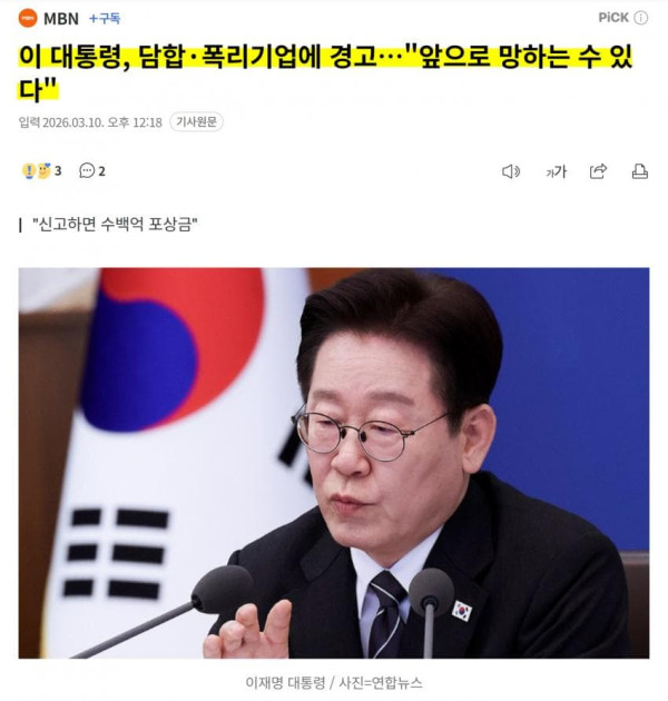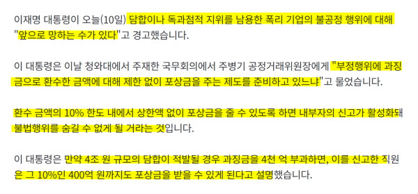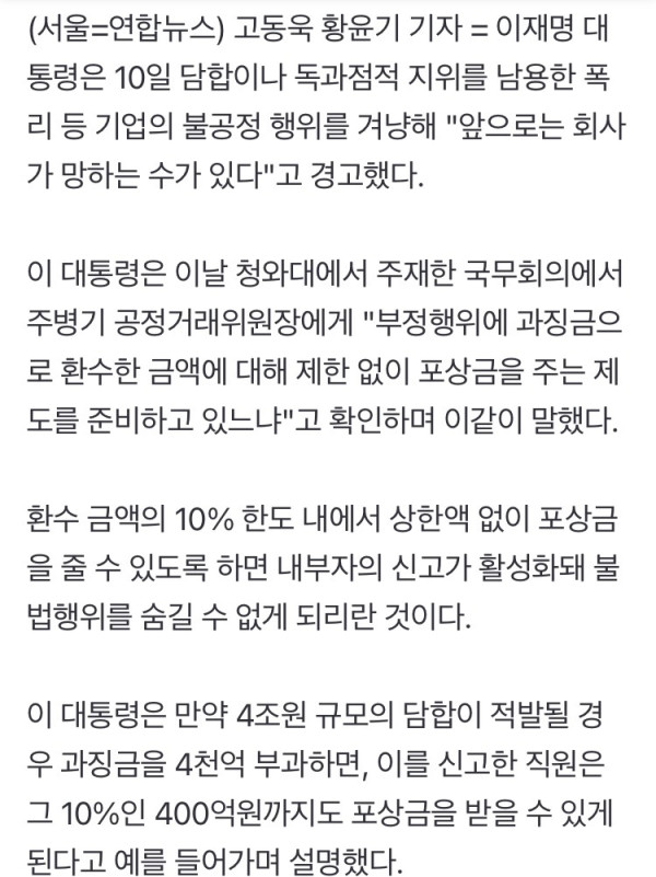 이재명 대통령이 오늘(10일) 담합이나 독과점적 지위를 남용한 폭리 기업의 불공정 행위에 대해