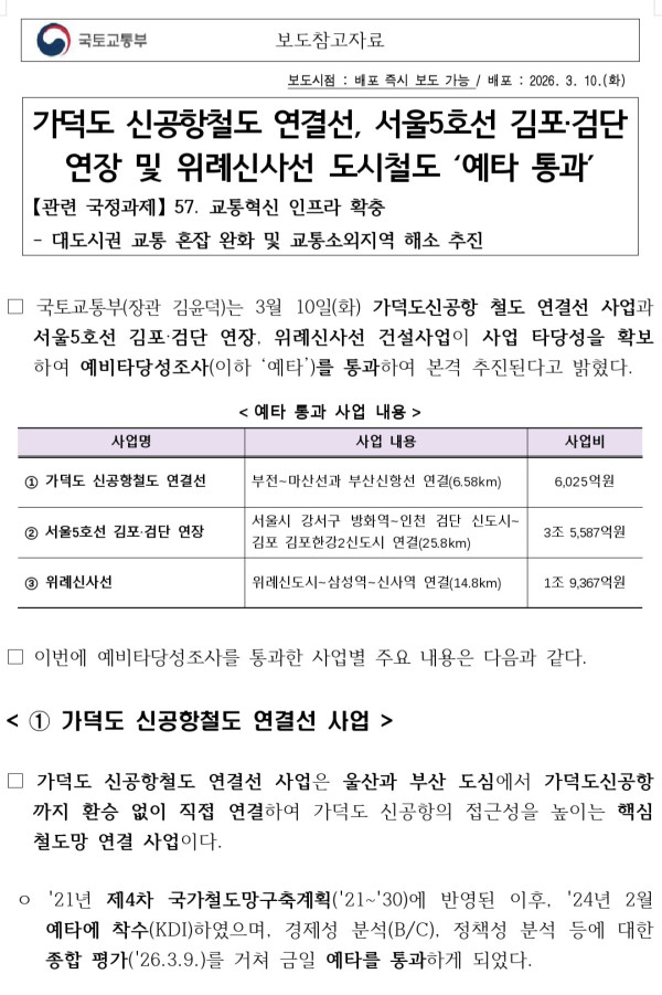 이번 회의에서 예타를 통과한 사업은 서울5호선 김포검단 연장, 위례-신사선 도시철도, 가덕도 신공항철도 연결선 건설사업 등 3개다.