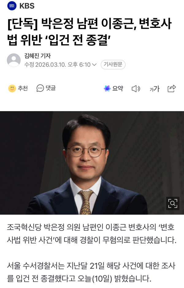 조국혁신당 박은정 의원 남편인 이종근 변호사의 ‘변호사법 위반 사건’에 대해 경찰이 무혐의로 판단했습니다. 서울 수서경찰서는 지난달 21일 해당 사건에 대한 조사를 입건 전 종결했다고 오늘(10일) 밝혔습니다. 검찰