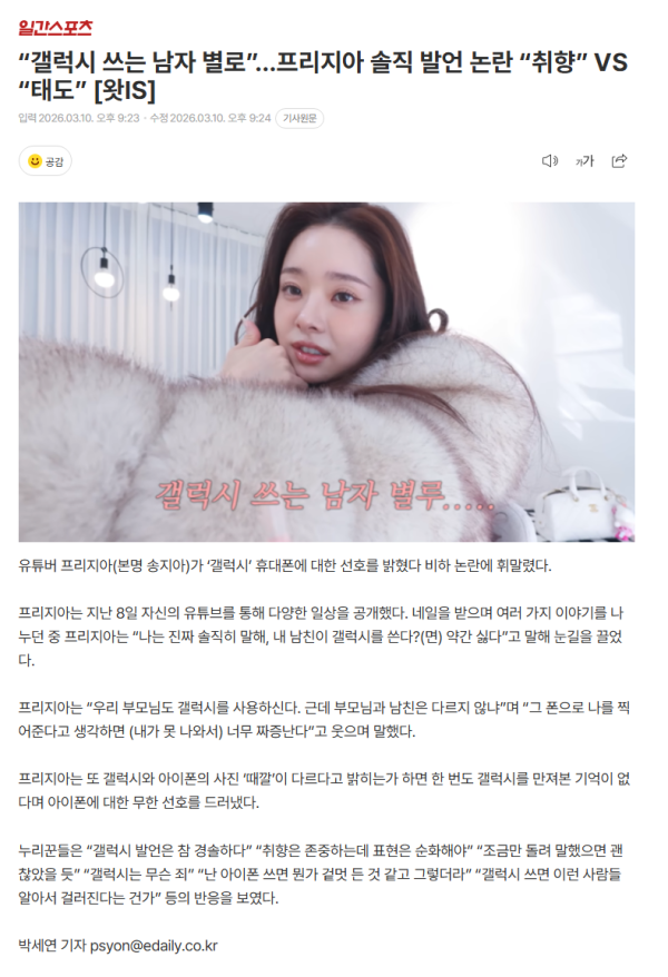 “갤럭시 쓰는 남자 별로”…프리지아 솔직 발언 논란