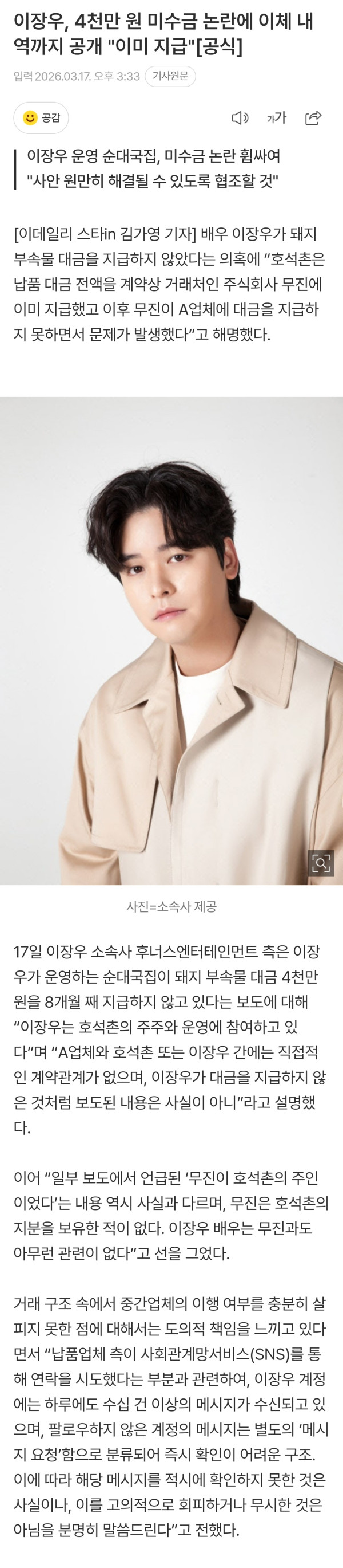 "돼지머리 대금, 부탁해요"…이장우, '순대국' 미수금 논란