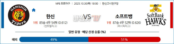 2025-10-30 NPB 한신 소프트뱅크 KBO/NPB분석 무료중계 스포츠분석