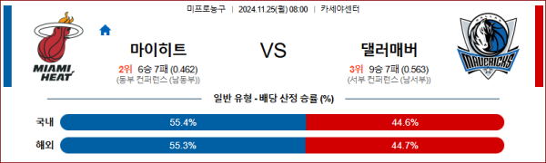 11월 25일(월) NBA 마이애미 댈러스 미프로농구 08시00분 완벽분석 꿀정보 !!