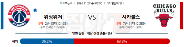 11월 27일(수) NBA 워싱턴 위자드 시카고 불스 미프로농구 09시00분 완벽분석 꿀정보 !!