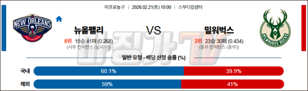 2026-02-21 NBA 뉴올리언스 펠린컨즈 밀워키 벅스 NBA분석 무료중계 스포츠분석
