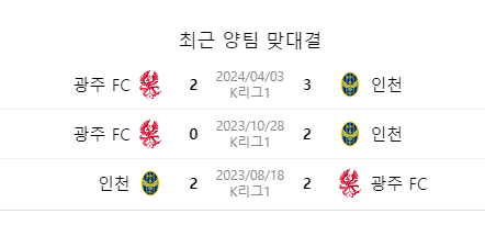 광주와의 대결에서는 상성에서 우위를 점하는 편이다. 인천이 여전히 선수비-후역습 성향을 보여주는 편인데, 광주가 이런 플레이에 약한 모습이다. 2023년 첫 매치에서 크게 깨진 이후에는, 인천이 4경기 무패를 달리고 있다. 역습 성향에서의 전개가 좋은 편이고, 최근에는 무고사가 살아나는 모습을 보여주고 있는 것도 긍정적인 부분이다.