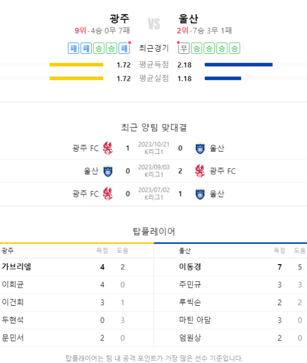 전반적으로 올 시즌 성적은 기대 이하. 하지만 울산을 상대로는 지난 시즌에 꽤 강했다는 점을 생각해볼 수는 있겠다. 실제로 광주가 올 시즌에도 공격적인 스타일을 유지하고 있는 상황인데, 울산은 지난 시즌도 그렇고 올 시즌엗ㅗ 압박 대응이 깔끔하게 이어지는 팀은 아니라고 보는 편이 낫다. 압박 전술을 유지하는 것이 오히려 경기의 키가 될 수도 있을 것.