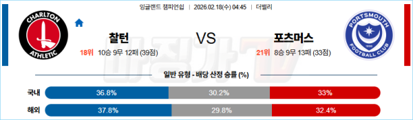 2026-02-18 잉글랜드 챔피언쉽 찰튼 포츠머스 FC 해외축구분석 무료중계 스포츠분석