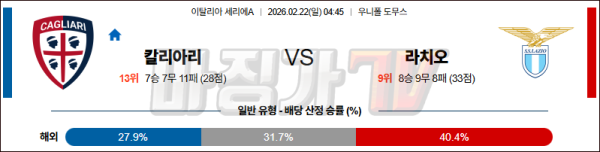 2026-02-22 세리에 A 칼리아리 칼초 SS 라치오 해외축구분석 무료중계 스포츠분석
