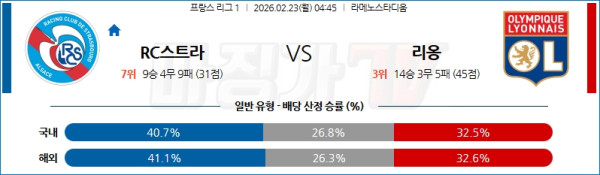 2602-02-23 리그앙 RC 스트라스부르 올랭피크 리옹 해외축구분석 무료중계 스포츠분석