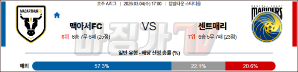 2026-03-04 호주 A리그 맥아서 FC 센트럴 코스트 마리너스 FC 해외축구분석 무료중계 스포츠분석