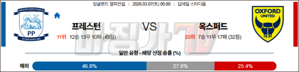 2026-03-07 잉글랜드 챔피언쉽 프레스턴 라이온스 옥스포드 유나이티드 FC 해외축구분석 무료중계 스포츠분석