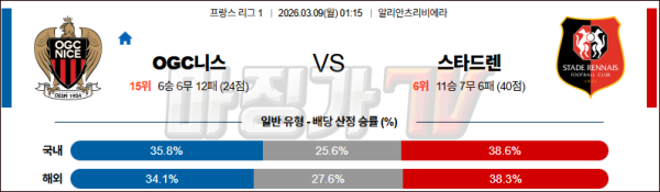 2026-03-09 리그앙 OGC 니스 스타드 렌 FC 해외축구분석 무료중계 스포츠분석