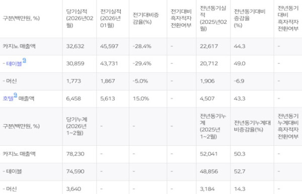 부문별로 살펴보면 카지노 테이블 매출의 성장이 압도적이었습니다. 2월 테이블 매출액은 308억 5,900만 원으로 전년 동기 대비 49% 늘어났습니다. 반면 머신 매출액은 17억 7,300만 원으로 6.9% 소폭 감소했습니다.카지노의 기초 체력을 의미하는 ‘테이블 드롭액’(고객이 칩으로 바꾼 총금액)은 2월 한 달간 1,514억 6,700만 원을 기록해 전년 대비 7.7% 증가했습니다. 호텔 부문 역시 객실 점유율 상승에 힘입어 64억 5,800만 원의 매출을 올리며 전년 동기 대비 43.3% 성장하는 기염을 토했습니다.올해 1월부터 2월까지의 누계 실적을 보면 성장세는 더욱 뚜렷합니다. 카지노 누계 매출은 782억 3,000만 원으로 전년 동기 누계 대비 50.3% 급증했습니다. 같은 기간 누적 드롭액 또한 3,849억 6,800만 원으로 전년 대비 47.1% 늘어나며 강력한 펀더멘털을 입증했습니다. 호텔 부문 누계 매출도 20.8% 증가한 120억 7,100만 원을 기록했습니다.
