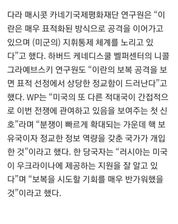 통신·방공시스템 족집게 타격 WP “러가 미군 위치 정보 제공” 이란이 중동에 배치된 미군 핵심 자산에 집중 공세를 퍼붓는 가운데, 러시아가 이를 지원하고 있다는 의혹이 제기됐다. 고도로 발달한 러시아의 표적 식별