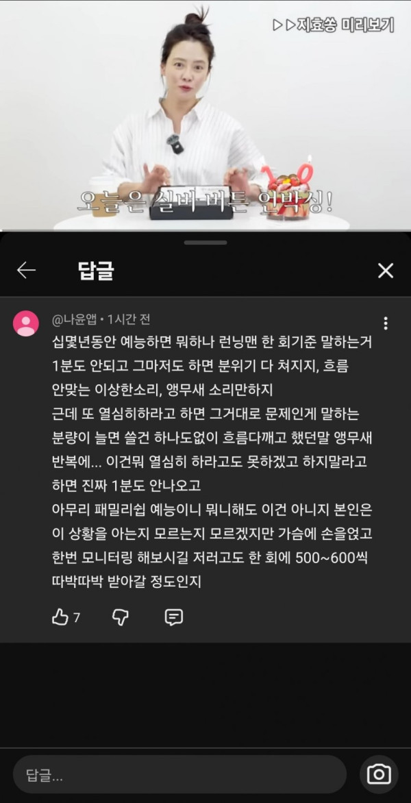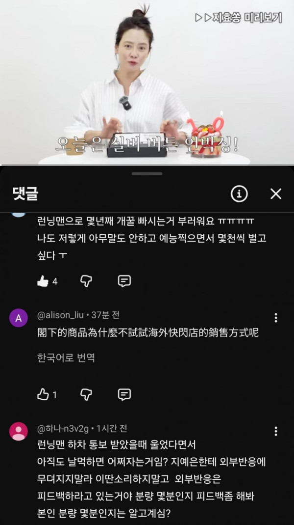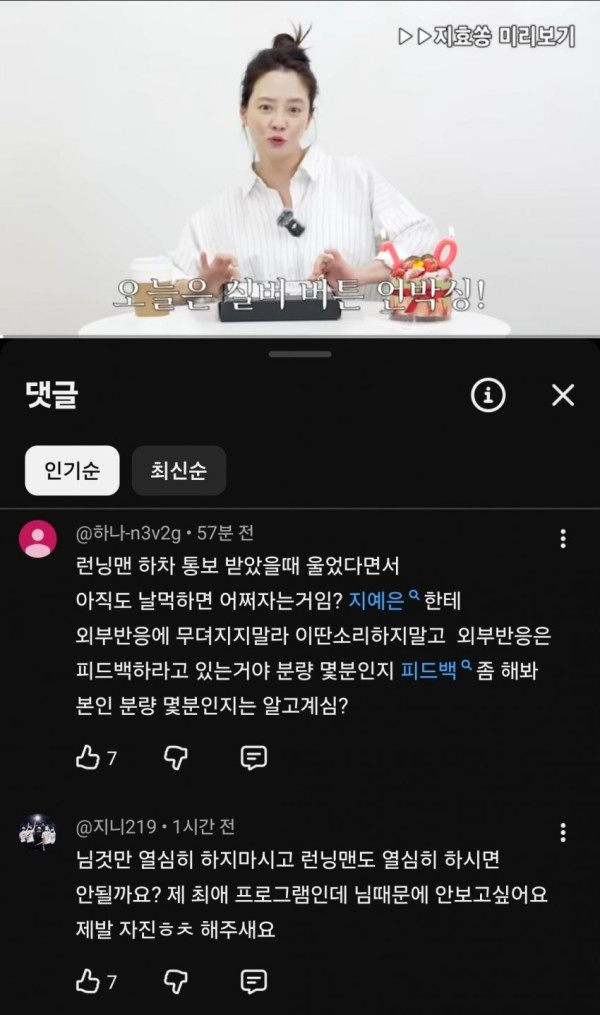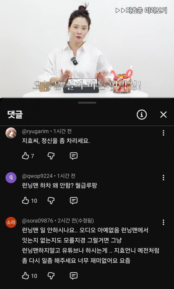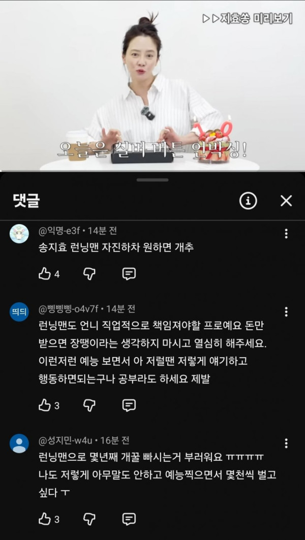 송지효 유튜브 댓글 점점 민심 10창 나는중